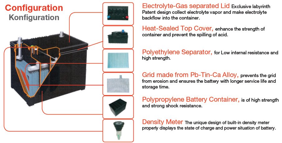 The internal electrode and gas collecting/exhausting system are specially designed to reduce self discharge and water loss, as well as the necessity of filling electrolyte or water. However, MF batteries still require proper installation, use and maintenance to extend their service time. |